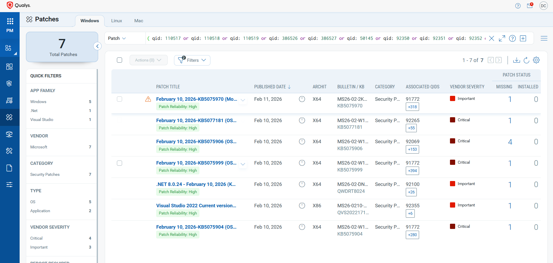 VMDR rapidly remediates Windows hosts by deploying the most relevant and applicable per-technology version patches. You can simply select respective QIDs in the Patch Catalog and filter on the “Missing” patches to identify and deploy the applicable, available patches with one click.